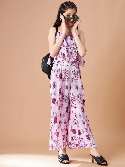 Girls Pink Floral Printed Top with Trousers