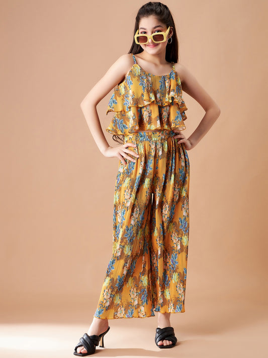 Girls Yellow Floral Printed Top with Trousers
