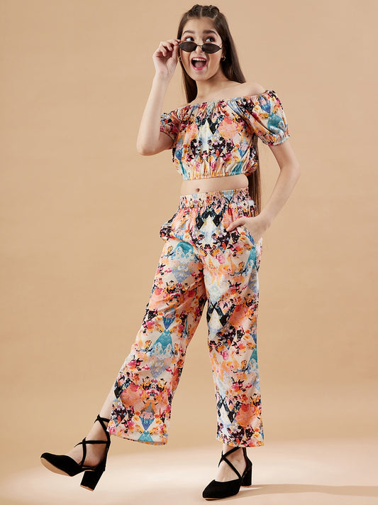 Cherry Jerry Girls Orange Floral Printed Relaxed Pleated Cotton Trousers