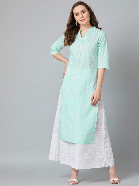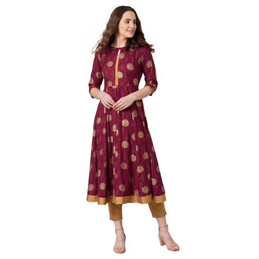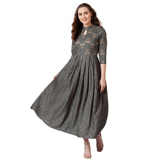 Women Charcoal Grey & Gold Block Floral Print Fit and Flare Dress