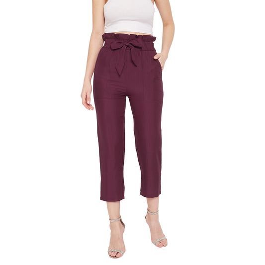 Wome Burgundy Solid Crepe Cigarette Trouser
