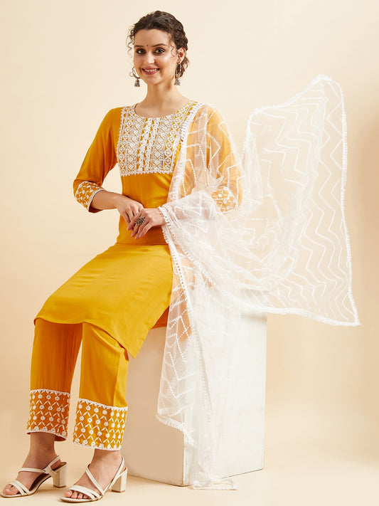 Yellow Ethnic Motifs Chinkari Work Regular Kurta with Trousers & Dupatta