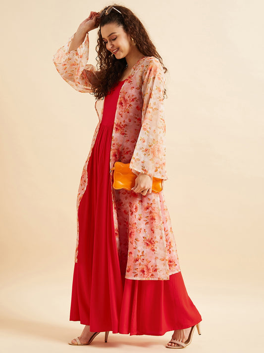 Shoulder Straps Fit & Flare Maxi Ethnic Dress With Printed Shrug