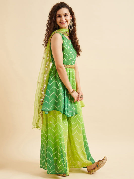 PANIT Green Bandhani Printed Zardozi Kurta with Sharara & With Dupatta