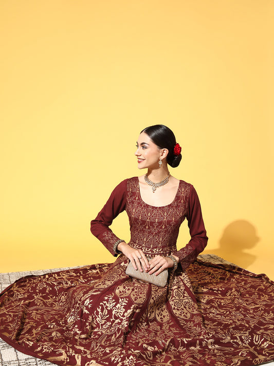 PANIT Maroon Ethnic Motifs Swirling Volume Dress