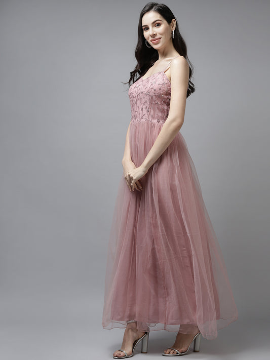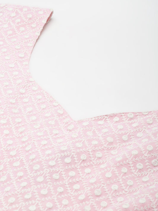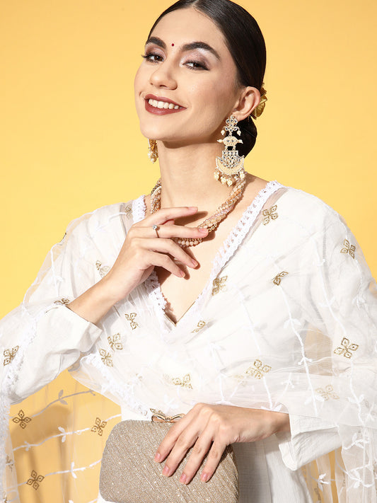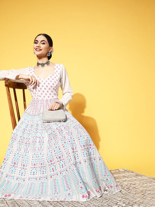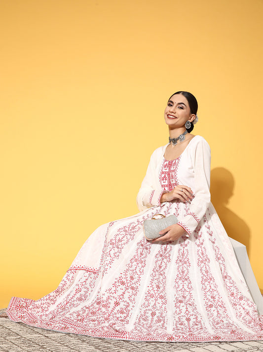 Pink & White Ethnic Motifs Embroidered Georgette Ethnic Maxi Dress With Dupatta