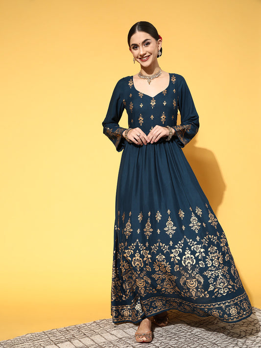 Women Tranquil Teal Ethnic Motifs Swirling Volume Dress