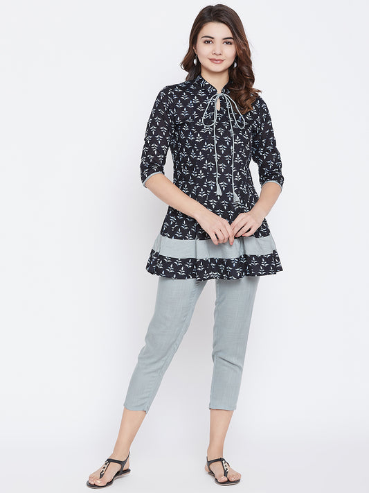 Navy Blue & Grey Printed Pure Cotton A-Line Pure Cotton Kurti