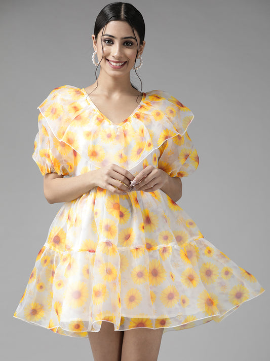 PANIT White Navy Blue Floral Printed Ruffled Layered A-Line Midi Dress