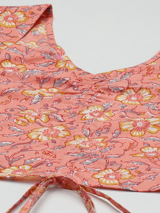 PANIT Peach-Coloured Yellow Floral Print Sweetheart Neck Pure Cotton Blouson Crop Top