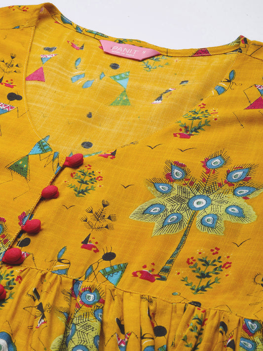 PANIT Women Yellow Black Tribal Printed Pleated Kurti