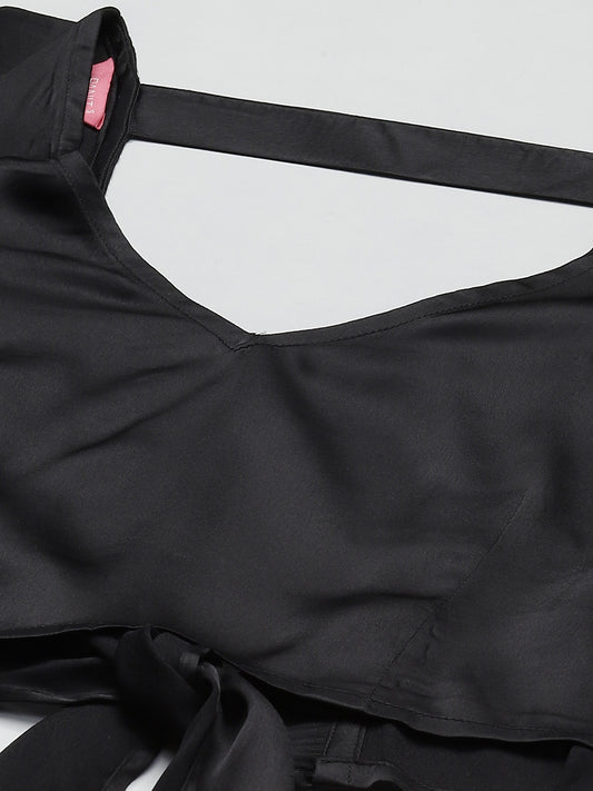 PANIT Black Red Floral Print Satin Blouson Crop Top