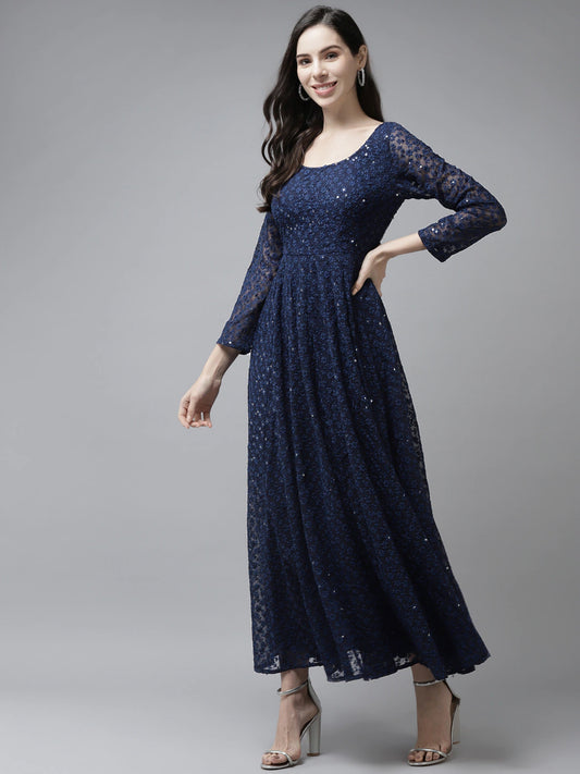 PANIT Women Navy Blue Ethnic Motifs Embroidered Ethnic Maxi Dress