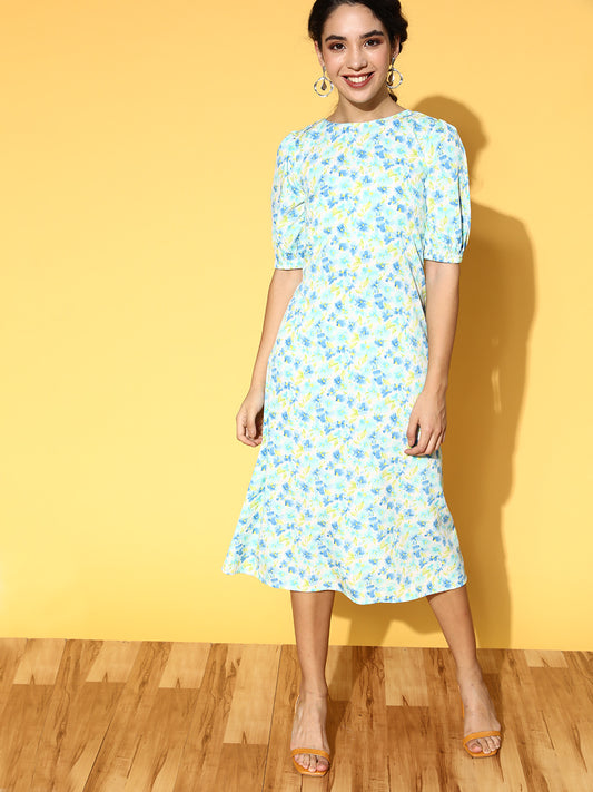 PANIT White Blue Floral Printed Styled Back A-Line Midi Dress
