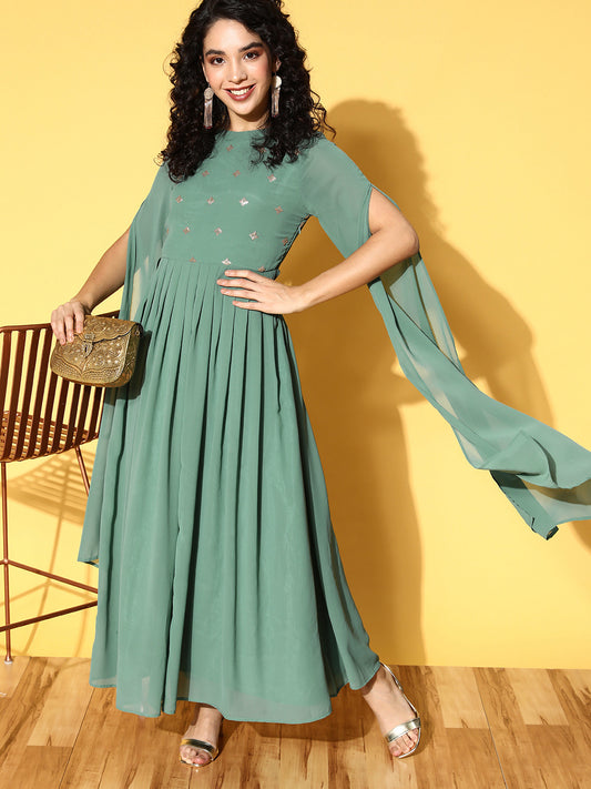PANIT Green Ethnic Motifs Embellished Georgette A-Line Maxi Dress