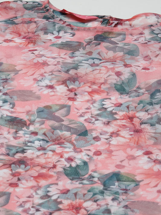 PANIT Pink Green Organza Floral Print Top