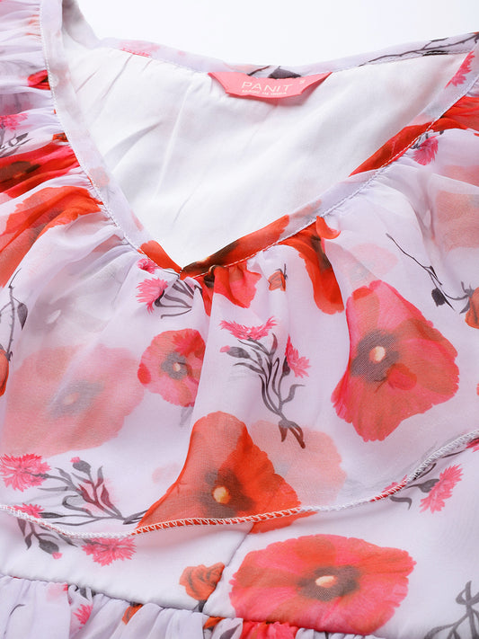 PANIT White Pink Floral Printed Georgette A-Line Midi Dress